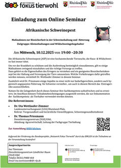 In der Fortbildungsveranstaltung wird die Problematik einer möglichen Einschleppung des ASP-Virus in Schweinebestände behandelt. Zudem wird das Thema der Fütterung im Allgemeinen und im Besonderen aufgegriffen.