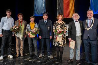 Hannes Ebener, Eva Bärthel, Carola Harnau, Gerhard Boy, Monika Straßburg, Christian Lhote und Stadtbürgermeister Peter Funck. Es fehlen Swetlana und Wladimir Werner