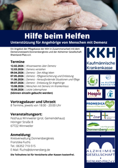 Dieses Angebot wird in Kooperation mit der KKH, der Alzheimer Gesellschaft Rheinland-Pfalz e.V. und dem Demenznetzwerk Donnersbergkreis durchgeführt.