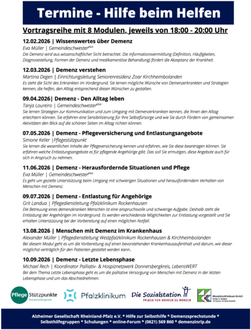 Eine Vortragsreihe für Angehörige von Demenzkranken und ehrenamtlichen Helfern startet am 12.02.2026 um 18:00 Uhr im Festhaust Winnweiler (prot. Gemeindehaus) in der Höringer Straße 8.