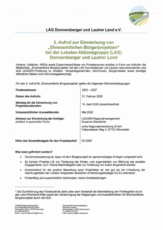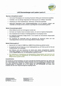 Weitere wichtige Informationen, die den Projektträger bei der Einreichung seines Projektsteckbriefs unterstützen, sind auf der Website der LAG Donnersberger und Lautrer Land zu finden. Dazu gehören: