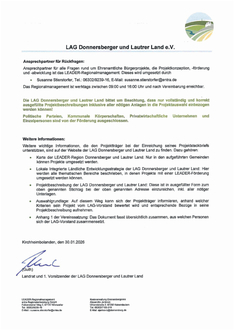 | • | Projektbeschreibung der LAG Donnersberger und Lautrer Land: Diese ist in ausgefüllter Form zum oben genannten Stichtag bei der oben genannten Adresse einzureichen, inkl. aller nötiger Unterlagen. |
