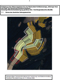Der Ortsgemeinderat von Kreimbach-Kaulbach hat die Aufstellung eines Bebauungsplanes für eine Photovoltaik-Freiflächenanlage „Höhninger Heck und Platte“ beschlossen und führt nunmehr auf der Grundlage des vom Planungsbüro BBP, Kaiserslautern, aufgestellten Vorentwurfes dieses Bebauungsplanes, in der Planfassung „Dezember 2023“, die frühzeitige Öffentlichkeitsbeteiligung gemäß § 3 Abs. 1 BauGB durch.