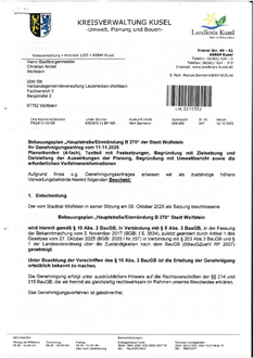 Der Stadtrat von Wolfstein hat in seiner Sitzung am 09. Oktober 2025 den Bebauungsplan „Hauptstraße / Einmündung B270“, aufgestellt von der BBP PartGmbB, Kaiserslautern, in der Planfassung „Oktober 2025“, mit den planungsrechtlichen und bauordnungsrechtlichen textlichen Festsetzungen und der Begründung mit Umweltbericht als Satzung beschlossen. Der Bebauungsplan wurde am 11. November 2025 der Kreisverwaltung Kusel zur Genehmigung vorgelegt. Die Kreisverwaltung Kusel hat mit Verfügung vom 12. Dezember 2025, Az.: 5/53/610-13 BP WS, den Bebauungsplan „Hauptstraße / Einmündung B 270“ der Stadt Wolfstein genehmigt.