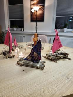 Auf dem Bild sind die fertiggestellten Flöße zu sehen. Die Trauergruppe Lebensrad trifft sich jeden 2ten Dienstag in den Räumlichkeiten des Ambulanten Hospizdienstes Lauterecken-Wolfstein. Anmeldungen unter hospiz@sozialstation-lauterecken.de oder 06382-993022.