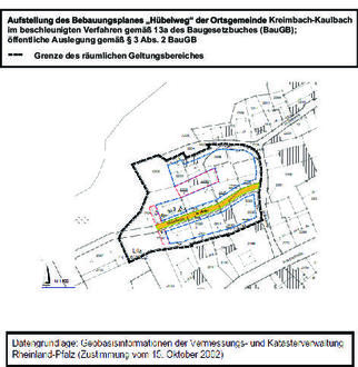Der Ortsgemeinderat Kreimbach-Kaulbach hat die Annahme des Entwurfes zur Aufstellung des Bebauungsplanes „Hübelweg“ im beschleunigten Verfahren gemäß § 13a BauGB, in der vom Planungsbüro BBP PartGmbB, Kaiserslautern, ausgearbeiteten Fassung beschlossen.