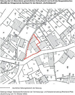 An dem im Geltungsbereich dieser Vorkaufsrechtssatzung liegenden Grundstück und Grundstücksteilen steht der Gemeinde Aschbach zur Sicherung einer geordneten städtebaulichen Entwicklung ein besonderes Vorkaufsrecht gemäß nach § 25 Abs. 1, Satz 1, Nr. 2 Baugesetzbuches (BauGB) zu.