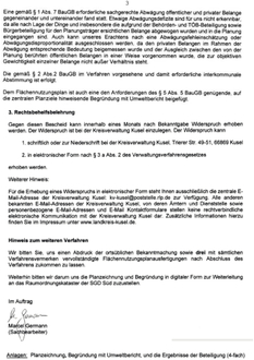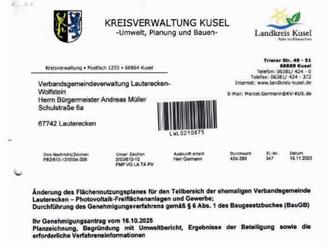 Der v. g. Änderungsplan wurde mit Schreiben vom 16. Oktober 2025 der Kreisverwaltung Kusel zur Genehmigung vorgelegt. Die Kreisverwaltung Kusel hat mit Verfügung vom 18. November 2025, Az.: 5/53/610-10/FNP VG LA TÄ PV, die Änderung des Flächennutzungsplanes, Teilbereich der ehemaligen Verbandsgemeinde Lauterecken – Photovoltaik – Freiflächenanlagen und Gewerbe genehmigt.