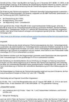 Der Verbandsgemeinderat Lauterecken-Wolfstein hat in seiner Sitzung am 26. April 2023 beschlossen, die Änderung des Flächennutzungsplanes Teilbereich der ehemaligen Verbandsgemeinde Lauterecken – Photovoltaik-Freiflächenanlagen und Gewerbe, aufgestellt von der BBP PartGmbB, Kaiserslautern, bestehend aus der Planzeichnung (M 1:7500), der Begründung, Teil A sowie der Begründung Teil B – Umweltbericht, endgültig festzustellen und mit den redaktionellen Änderungen in der Planfassung April 2023 anzunehmen.