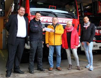 Tobias Schuh und Timo Becker (FFW Quierschied), Dieter und Elisabeth Klein sowie Nadja Hampel (Gemeinde Quierschied, v.li.n.re.).