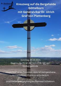 | Gö 15:00 Uhr | Kreuzweg auf die Halde Göttelborn mit H. H. Generalvikar Dr. Ulrich Graf von Plettenberg, anschl. Begegnung im Pfarrheim Göttelborn |