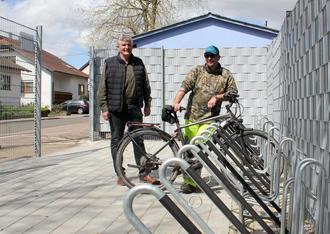 Bürgermeister Lutz Maurer (links) freut sich wie Schwimmmeister Christian Straßburger über die neue Fahrradabstellanlage am Freibad Quierschied.