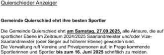 Die Gemeinde Quierschied ehrt am Samstag, 27.09.2025, alle Akteure, die auf sportlicher Ebene im Zeitraum 2024/2025 Saarlandmeister und/oder Vize-Saarlandmeister (oder Sieger auf höherer Ebene) geworden sind.