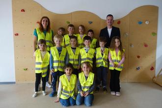 Die Kinder der KiTa Villa Regenbogen freuen sich über neue Verkehrswarnwesten, die ihnen ab sofort mehr Sicherheit im Straßenverkehr bieten.