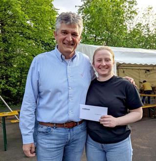 Bürgermeister Lutz Maurer überreichte der Vorsitzenden des ASC Quierschied einen Zuschuss der Gemeinde zum 31. Maifest.
