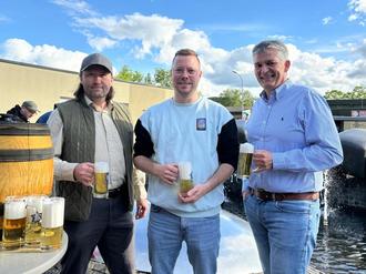 Fassanstich zum Fischbacher Brunnenfest 2024: Ortsvorsteher Marcus Jung, Sebastian Schumacher (Theaterverein Saargold) und Bürgermeister Lutz Maurer (v.li.n.re.).