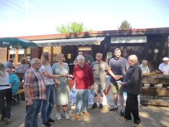Zur Mittagszeit wurde Spießbraten mit Kartoffel- und Nudelsalat, Erbsensuppe und Bratwürsten angeboten. Der Andrang war groß und so war es nicht verwunderlich, dass in kurzer Zeit fast alles aufgebraucht war. Gut, dass unser Vorsitzender Harald Stamm vorgesorgt hatte und noch Schwenkbraten in Reserve hielt.