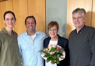 Frau Mosebach-Schwarz (2. von rechts) wurde von Bürgermeister Lutz Maurer, Karsten Schommer (Personalrat) und Bianca Pütz (Kita Pusteblume) verabschiedet.