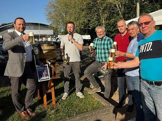 Ortsvorsteher Marcus Jung (links) und Bürgermeister Lutz Maurer (2. von rechts) beim Fassanstich zum Brunnenfest 2025.