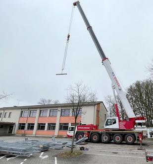 Die Teile für die beiden Treppentürme in Fischbach-Camphausen wurden mit Hilfe eines über 20 Meter hohen Krans platziert.