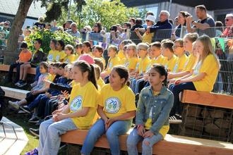 Mindestens genauso wie die Entwicklung der Schule beeindruckte den Quierschieder Verwaltungschef das Programm, welches das aktuelle Kollegium um Schulleiterin Vera Friedling gemeinsam mit den Schulkindern und in Zusammenarbeit mit zahlreichen Vereinen, darunter der Förderverein der Schule, anlässlich des Schulfests auf die Beine gestellt hat: Eine Mitmach-Olympiade erstreckte sich über unzählige Stationen im und am Gebäude, gerahmt von einem unterhaltsamen Bühnenprogramm u.a. mit Akrobatik-, Tanz- und Gesangseinlagen und für die Verpflegung war selbstverständlich auch gesorgt. Gegen 13 Uhr dann staunten die nicht eingeweihten Anwesenden dann nicht schlecht, als alle Lehrkräfte der Schule zusammen mit den Schülerinnen und Schülern auf dem oberen und dem unteren Schulhof mit einem einstudierten Flashmob für eine gelungene Überraschung sorgten.