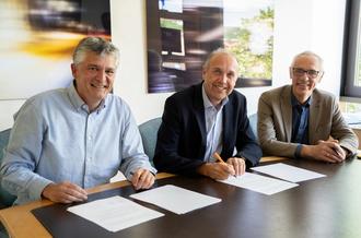 Vertragsunterschrift, v.l.n.r. Lutz Maurer (Bürgermeister Quierschied), Michael Dewald (Geschäftsführer energis), Wolfgang Martin (Prokurist energis)