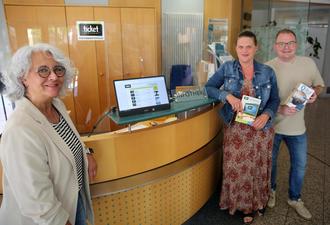 TR-VVK-Stelle 1: Die Info-Mitarbeiterinnen Barbara Frania und Sabine Schommer (v.li.) mit Robin Schmelzer von der Stabstelle Kultur und Veranstaltungsmanagement.