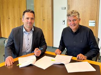 Bürgermeister Lutz Maurer (rechts) und Christian Heck von der LOGIC GREEN Services GmbH unterzeichnen die Planungs- und Entwicklungsvereinbarung für die Entwicklung des Gewerbegebiets "Am Wasserturm" in Göttelborn.