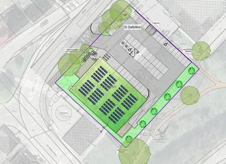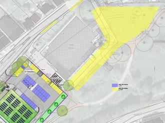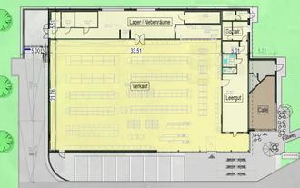 Demnach soll der Netto-Markt gegenüber der Fischbachhalle und von der Zufahrt aus gesehen auf der rechten Seite des Marktplatzes errichtet werden (s. Grafiken). Der Eingangsbereich zeigt dabei zur Fischbachhalle hin. Die Verkaufsfläche würde 750 Quadratmeter betragen, hinzu kommt ein angegliedertes Café (etwa 50 Quadratmeter) mit Innen- und Außensitzbereich. Das Gebäude würde wenige Meter über die derzeit bepflasterte Fläche des Marktplatzes hinaus in die angrenzende Böschung reichen. Der Streifen zwischen dem dann neu gestalteten Marktplatz und Waldparkanlage wird auf einer Fläche von etwa 430 Quadratmetern neu begrünt. Da zwischen dem Netto-Markt und der Fischbachhalle nach der Umgestaltung des Platzes nur noch 50 Stellplätze zur Verfügung stehen würden, ist aus baurechtlichen Gründen die Schaffung weiterer Stellplätze für den Betrieb der Fischbachhalle erforderlich. Die Potenzialfläche hierfür ist der Bereich zwischen der Halle und der Waldparkanlage und die an der Zufahrt gelegene Freifläche (gelb markiert).