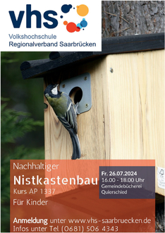 Die Bausätze sind so gestaltet, dass eine kinderleichte Handhabung gewährleistet ist. Besondere handwerkliche Fähigkeiten sind somit nicht erforderlich. Die Veranstaltung eignet sich insbesondere für Kinder ab ca. 6 Jahren in Begleitung eines Erwachsenen. Pro Familie kann ein Nistkasten aus Holz gebaut werden, der dann später im eigenen Garten aufgehängt werden kann.