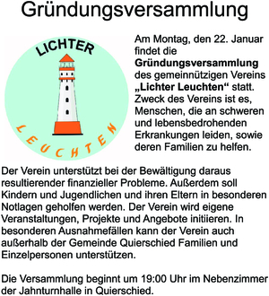 Am Montag, den 22. Januar findet die Gründungsversammlung des gemeinnützigen Vereins „Lichter Leuchten“ statt.