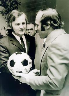 Günter Bernarding (links) nimmt den unterschriebenen Fußball von Uwe Seeler in Empfang.