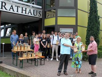 Am Donnerstag, 21. Juli, fuhr einige Minuten vor 12 Uhr ein großer Reisebus am Rathaus vor. Wenig später stiegen etwa 20 Schülerinnen und Schüler der Klassen AV1, AV2 und AV3 des Berufsbildungszentrums (BBZ) Sulzbach aus. Begleitet von ihrem Klassenlehrer Michael Rasch (AV 1), Klassenlehrerin Jeanine Horn (AV2), Abteilungsleiterin Petra Klein, Praxislehrer Oliver John und Thomas Stuhlsatz sowie Jana Schmidt vom Sozialpädagogischen Fachdienst. Im Gepäck hatten die jungen Menschen über 20 selbstgebaute Vogel-Nistkästen.