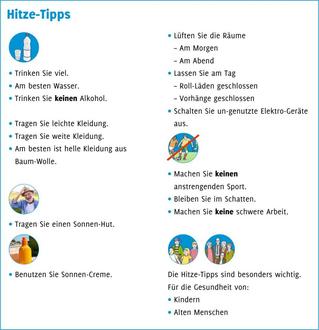 | • | Passen Sie ihren Tagesablauf so gut wie möglich an die Hitzeentwicklung an! |