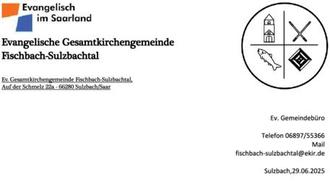 Das Zentralbüro der Ev. Gesamtkirchengemeinde Fischbach-Sulzbachtal ist in Sulzbach, Auf der Schmelz 22a, 66280 Sulzbach/Saar, Tel 06897/55366; E-Mail: fischbach-sulzbachtal@ekir.de