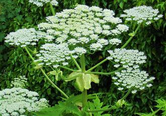 Riesenbärenklau, auch bekannt als Herkulesstaude (Heracleum mantegazzianum), ist eine invasive Pflanze, die ursprünglich aus dem Kaukasus stammt und sich in Europa stark ausgebreitet hat. Sie ist bekannt für ihre Größe und die großen, weißen Blütendolden, aber auch für ihre Giftigkeit. Alle Pflanzenteile enthalten das Gift Furocumarin. In Verbindung mit dem Sonnenlicht (UV-Strahlen) führt dieses Gift zu schweren Verbrennungen und langwierigen allergischen Hautreaktionen. Die betroffenen Hautstellen verfärben sich bräunlich und reagieren unter Lichteinwirkung mit Verbrennungen 1. Grades (Rötungen) und 2. Grades (Brandblasen), die in schweren Fällen erst nach Wochen abheilen, wobei Narben zurückbleiben. Besonders Kinder sind durch die Pflanze gefährdet, wenn sie aus den hohlen Stängeln Blas- oder Fernrohre bauen oder beim Spielen mit der Pflanze in Berührung kommen. Wäscht man den Pflanzensaft unmittelbar nach Kontakt mit Wasser ab, besteht meist keine größere Verletzungsgefahr.