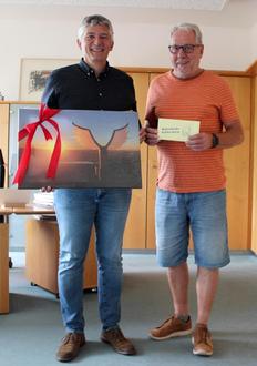 Bürgermeister Lutz Maurer (links) überreicht Stefan Hofmann das Preisgeld und eine Leinwand mit dem Sieger-Foto.