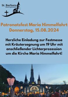 Am 15. August feiert die Kirche das Hochfest der Aufnahme Mariens in den Himmel. Wir dürfen an diesem Tag in Maria Himmelfahrt Quierschied auch das Patronatsfest begehen. Dieses Jahr feiern wir die Festmesse am 15.08.2024 um 19 Uhr, anschließend ist Lichterprozession mit der Muttergottesfigur um die Kirche.
