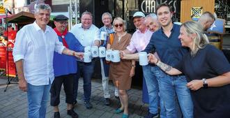 Bürgermeister Lutz Maurer, Wolfgang Schug, Markus Uhl, Paul Pendorf, Anja Wagner-Scheid, Patrik Pabst, Stefan Ziegler, Esra Limbacher und Jessica Heide (v.li.n.re.) beim offiziellen Fassanstich.