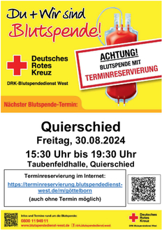 Nächster Blutspendetermin in Quierschied ist am 30.08.24 in der Taubenfeldhalle von 15:30 Uhr bis 19:30 Uhr.