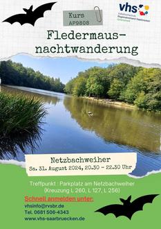 Naturschutzbeauftragter im Gemeindebezirk Quierschied, bei Einsetzen der Dämmerung den Fledermausdetektor aus. Ausgerüstet mit Taschen- oder Stirnlampen können am Netzbachweiher die spektakulären Flugfähigkeiten der nachtaktiven Säugetiere beobachtet und die für unsere Ohren unhörbaren Rufe der Fledermäuse erlebt werden. Spannendes und Wissenswertes über Fledermäuse lässt den Abend zu einem unvergesslichen Event werden. Die Veranstaltung eignet sich für Kinder in Begleitung einer Erwachsenen Person.