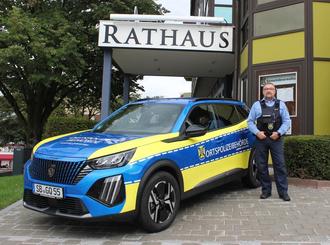 Gemeinde-Mitarbeiter Thomas Urig von der Ortspolizeibehörde präsentiert das neue Dienstfahrzeug.