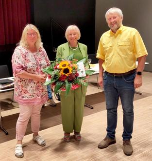 Die Fraktionsvorsitzenden Britta Hess (links, SPD) und Stefan Chadzelek (rechts, CDU), verabschieden Hauptamtsleiterin Birgit Biehl.