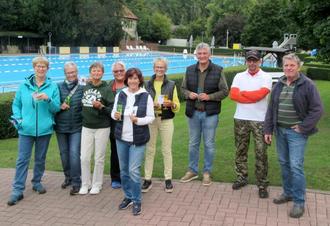 Bürgermeister Lutz Maurer (Dritter von rechts) und Schwimmmeister Christian Straßburger feiern zusammen mit einigen Gästen und Mitgliedern des Fördervereins Freibad Quierschied den Abschluss der Badesaison 2024.