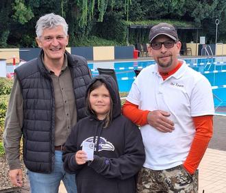 Paula ist stolze Trägerin des „Totenkopf-Abzeichens in schwarz“, das man bekommt, wenn man eine Stunde ohne eine Rand-, Wand- oder Bodenberührung schwimmen kann. Überreicht haben es Bürgermeister Lutz Maurer (links) und Schwimmmeister Christian Straßburger.