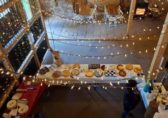Ein Blick auf die Kuchentheke des Fördervereins Freibad Quierschied vor dem großen Ansturm in der wunderschön dekorierten Scheune des Forsthaus Neuhaus.