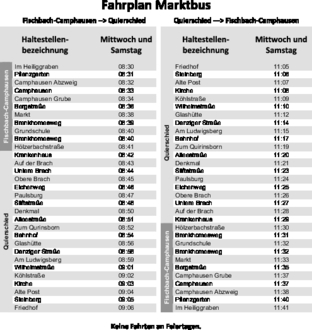 Der Bus fährt an den beiden Markttagen Mittwoch und Samstag. Um 8.30 Uhr startet jeweils die Hinfahrt, um 11 Uhr die Rückfahrt. Es wird ein Kleinbus (20 Plätze) der Firma Huwig Reisen aus Fischbach-Camphausen eingesetzt.