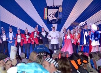 Bürgermeister Maurer (Bildmitte in weiß) nahm erfolgreich an der ersten Kappensitzung des Jahres in der Gemeinde Quierschied teil. Sie fand in der Göttelborner Mehrzweckhalle statt und wurde vom KV „Von der Höh" Göttelborn veranstaltet.