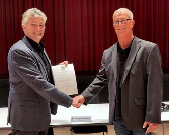 Der alte und neue Bürgermeister Lutz Maurer (links) mit der Ernennungsurkunde, die ihm kurz zuvor nach dem Ablegen des Amtseides vom Gemeindebeigeordneten Rudi Schmitt (rechts) ausgehändigt wurde. Mehr zur 3. Sitzung des Gemeinderates vom 26. September 2024 auf Seite 3 im Innenteil.