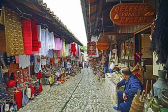 Der Bazar von Kruja Krujas. Charakteristischer kopfsteingepflasterter Basar, der direkt zur Burg führt, wird durch Ladenzeilen auf beiden Seiten ergänzt.